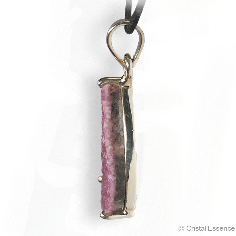 Pièce unique dont les dimensions sont 3,2 cm cm x 1,6 cm pour une épaisseur de 0,6 cm et un poids de 6,6 g. Ce pendentif rose foncé est d'une très belle qualité avec une belle brillance.